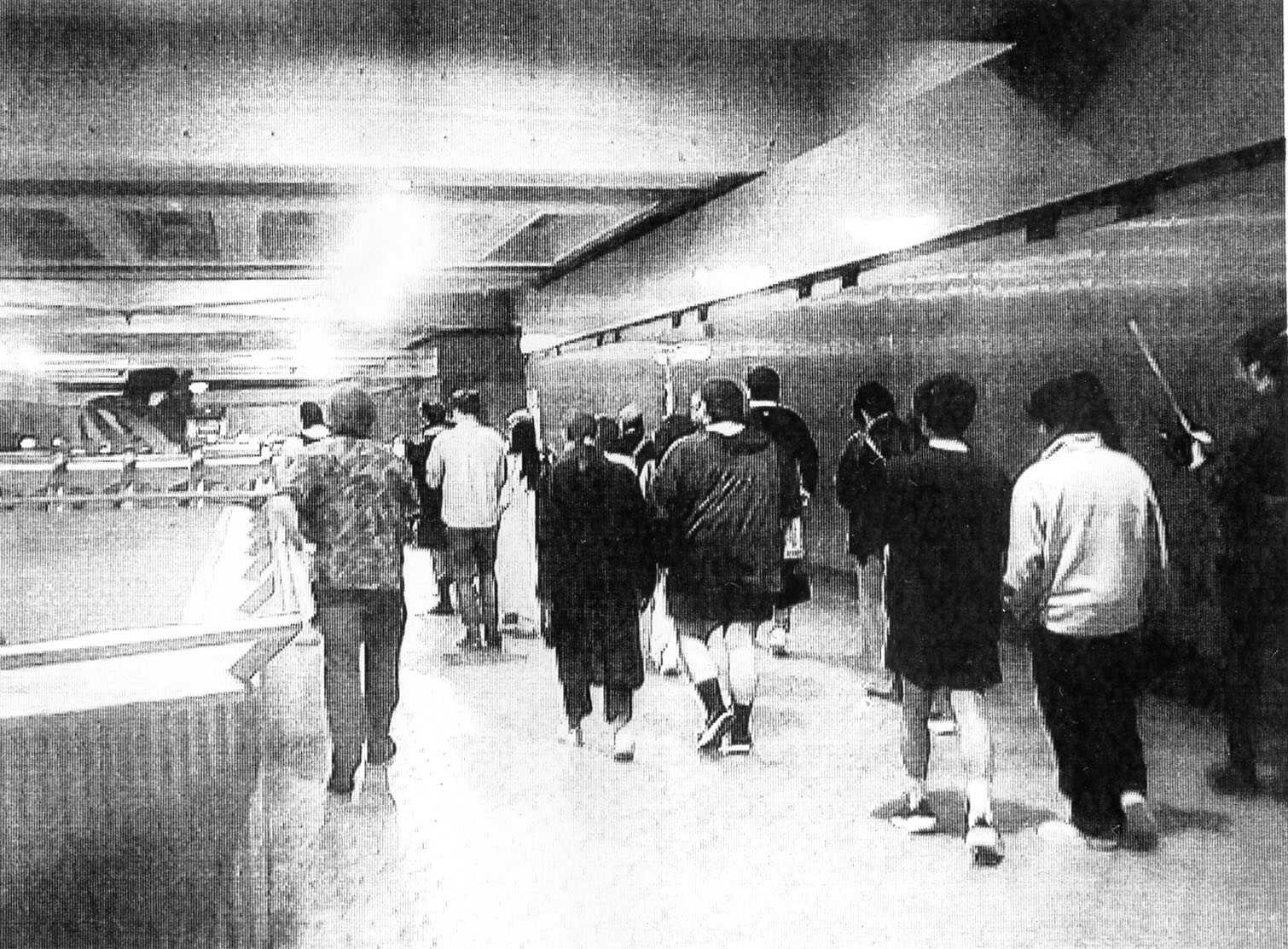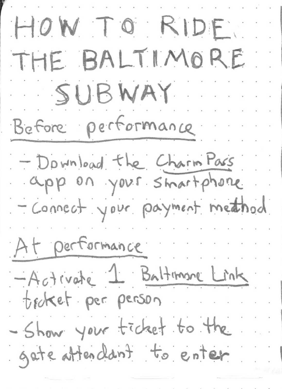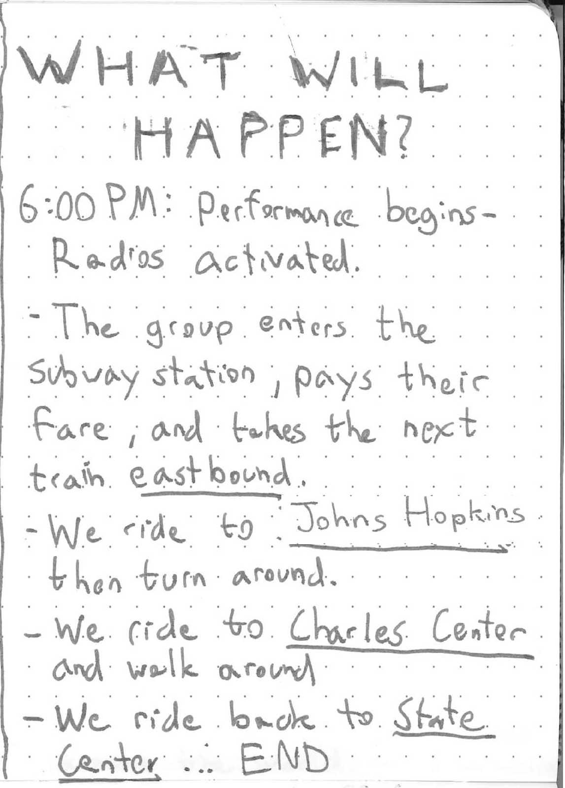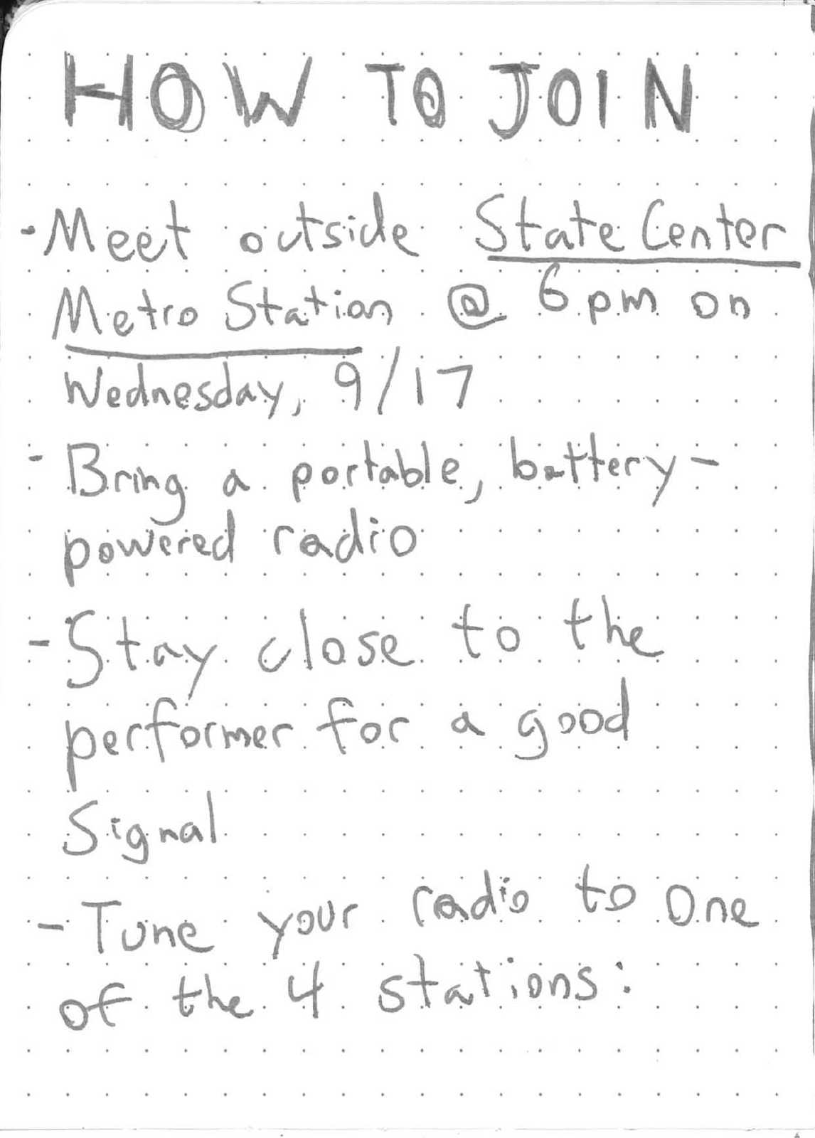 The performance begins outside the Metro Station, as the performer enters the station with attendees in tow. The performer walks through the station, through the fare gate (paying their fare!), and onto a subway car, all with attendees following along, carrying their radios. The group rides the subway back and forth along its route, with posted arrival times, allowing new attendees to join the group at other stations.