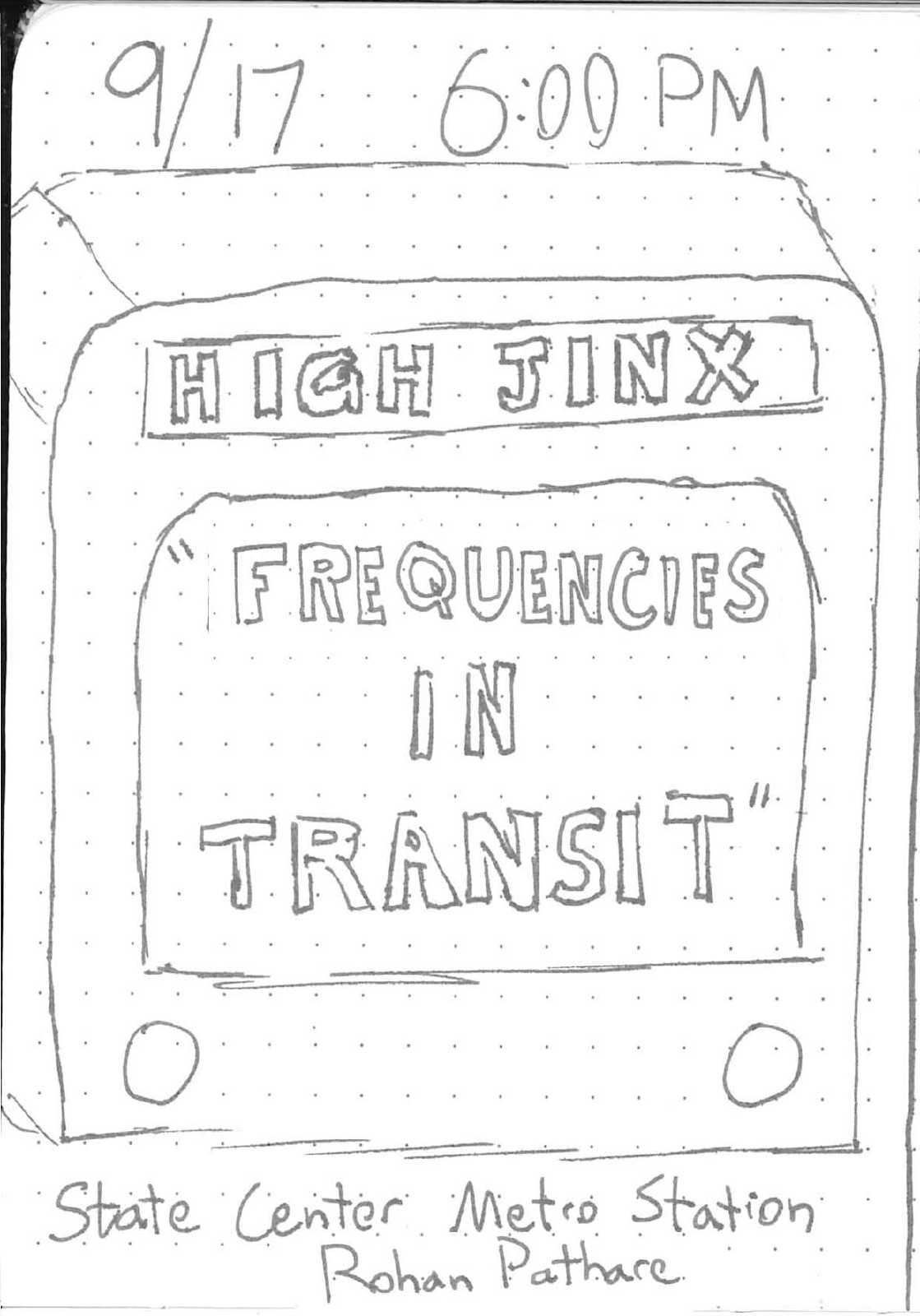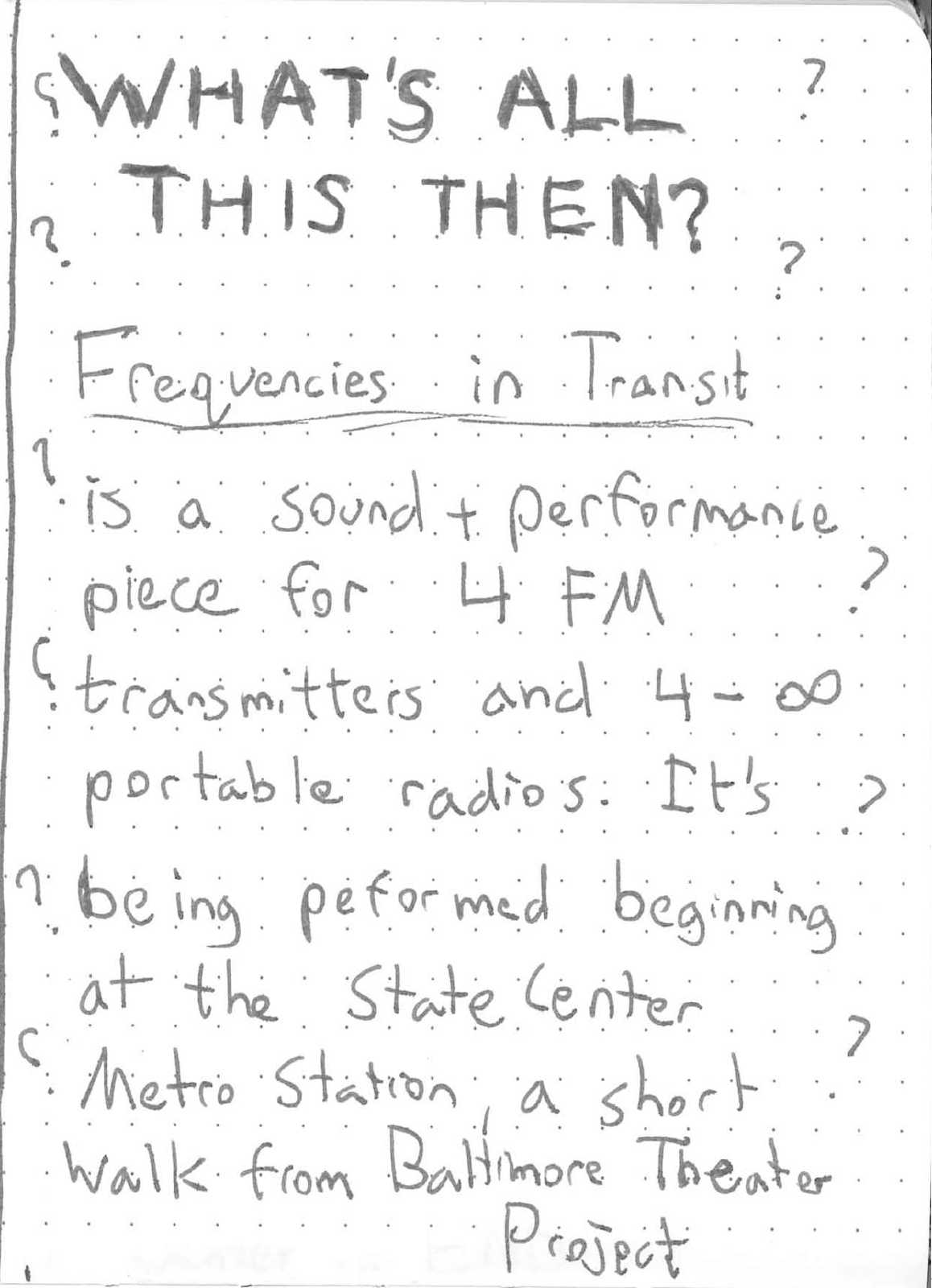 Frequencies in Transit is a participatory performance and sound piece for FM transmitters, portable radios and subway systems. It was created for High Jinx, a part of the High Zero Festival. Its premiere was on September 17, 2025 at the State Center Metro Station in Baltimore, MD.